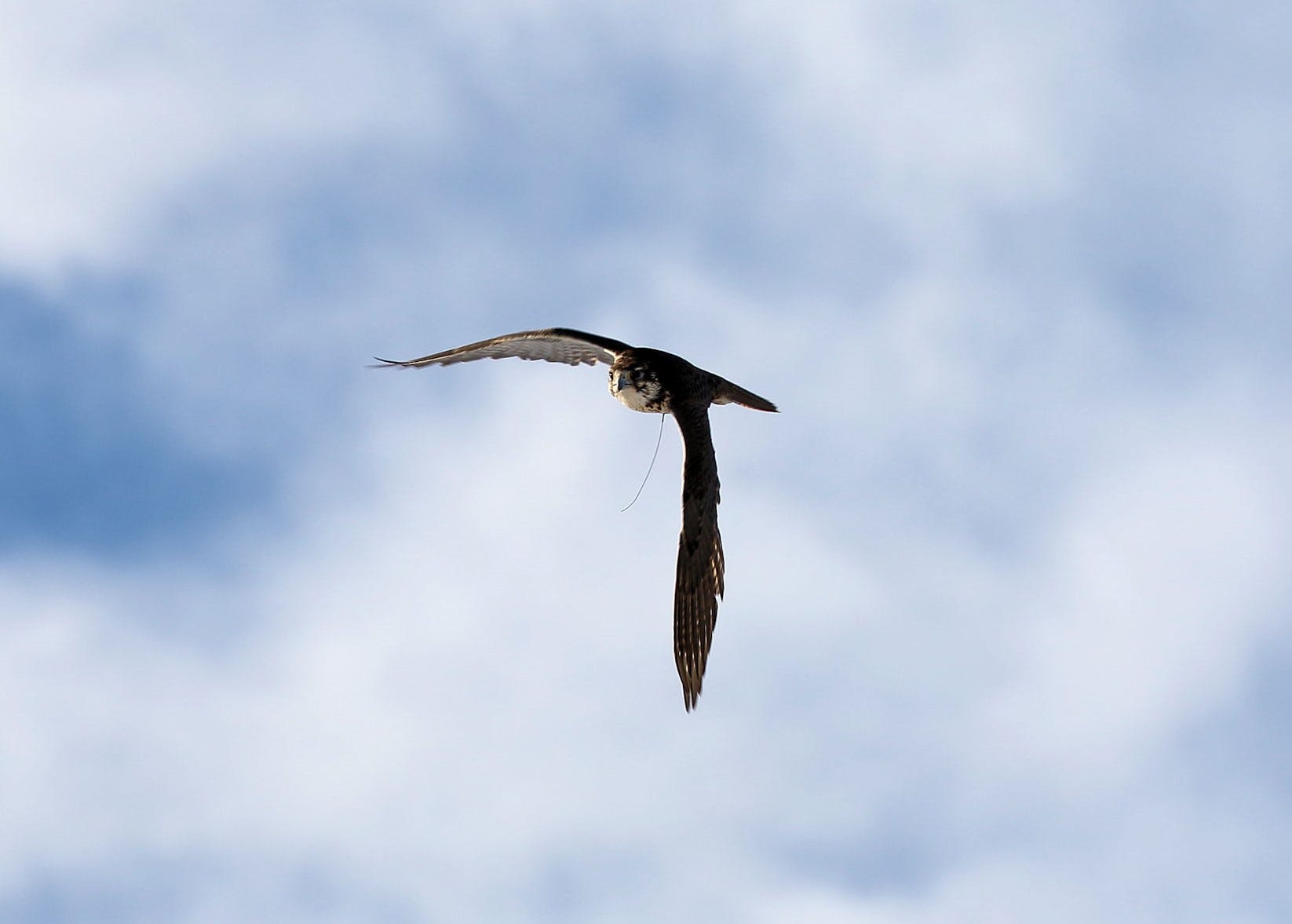The falcon returned, having been out gunned by the grouse. We worked the ground with the dogs but didn’t find any stragglers. When the falcon was wide and high, I tossed a fast pigeon as a reward for a second effort and the falcon slipped behind the pigeon and the prey fell from the sky seemingly untouched. I had only expected a chase. In her third season, she has gained striking precision with her finely pointed talons. She dragged the pigeon under a sagebrush between us. The marks of the grouse wings and tail brushed in the snow where it briefly lost altitude then took back the sky.